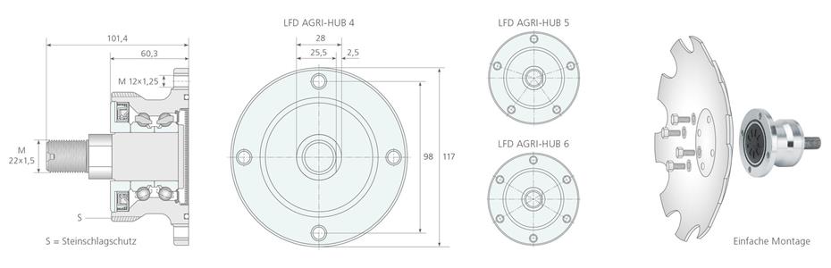 LFD bietet diese Lagereinheit auch mit einem zusätzlichen Steinschlagschutz (S) an. Feldarbeiten laufen infolgedessen absolut zuverlässig. Die wartungsfreien LFD AGRI-HUBs erlauben einen schnellen Ein- und Ausbau. Dadurch werden zusätzlich Kosten reduziert.