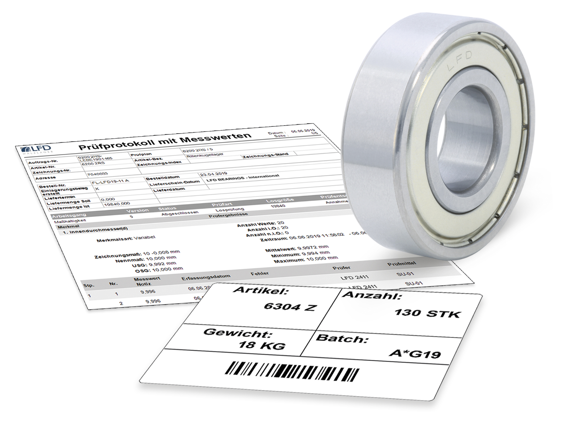 Somit kann LFD anhand der Batchcodes oder mittels Lieferscheinnummer jedes Wälzlager bis an seinen Ursprung zurückverfolgen. So können jederzeit Auskünfte über die Messdaten abgefragt werden.